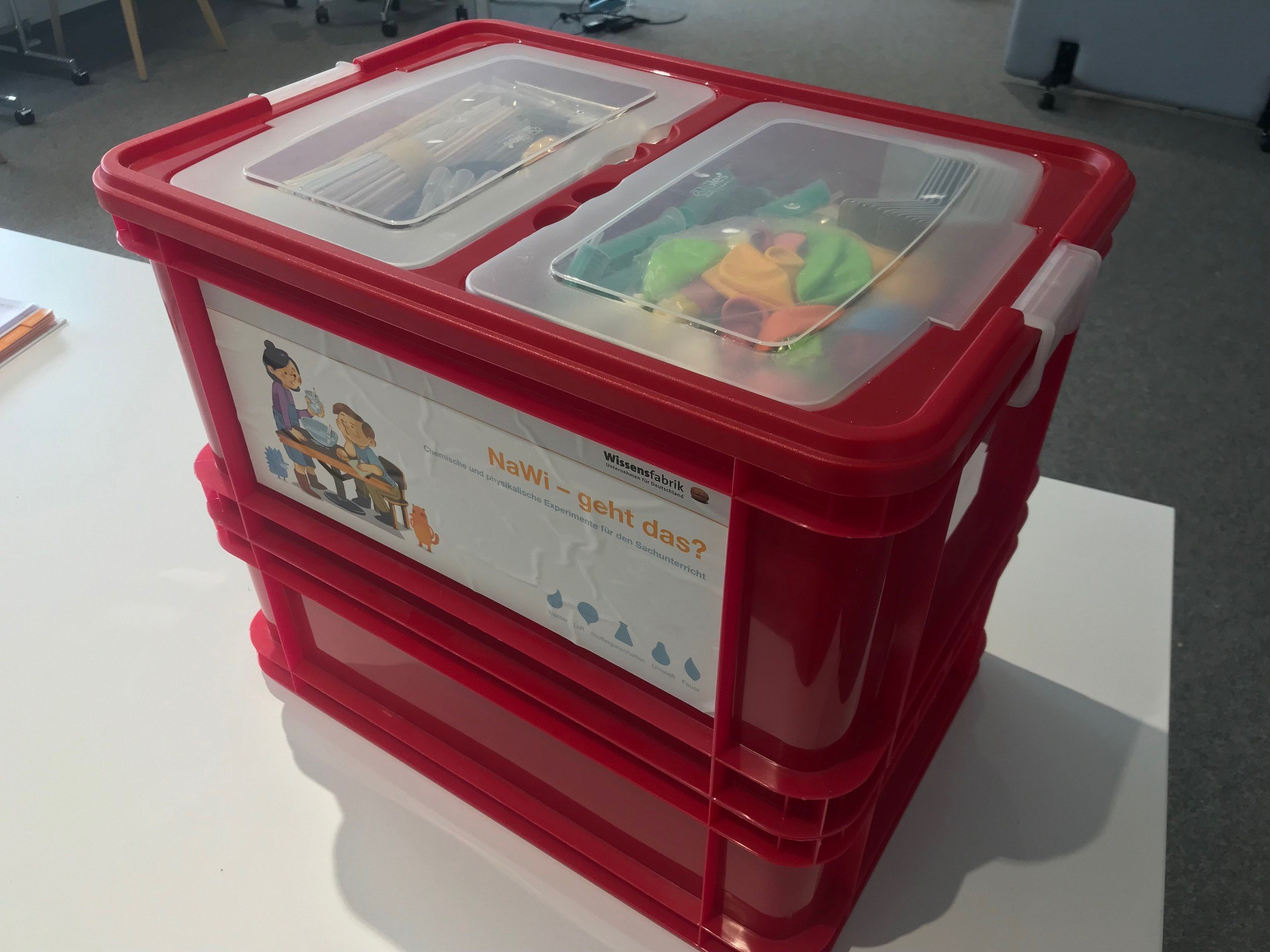 - Material: Handbuch für Lehrkräfte und Unterrichtsmaterial für Schüler*innen (auch herunterladbar), Forscherkiste als Klassensatz sowie drei Zusatzboxen und Projektordner.
